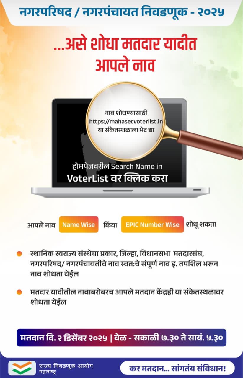 लोणावळा नगरपरिषदेच्या सार्वत्रिक निवडणूक २०२५ मतदान केंद्रनिहाय याद्या मधील मतदारांनी नाव शोधण्यासाठी वरील क्रमांकावर संपर्क करावा.